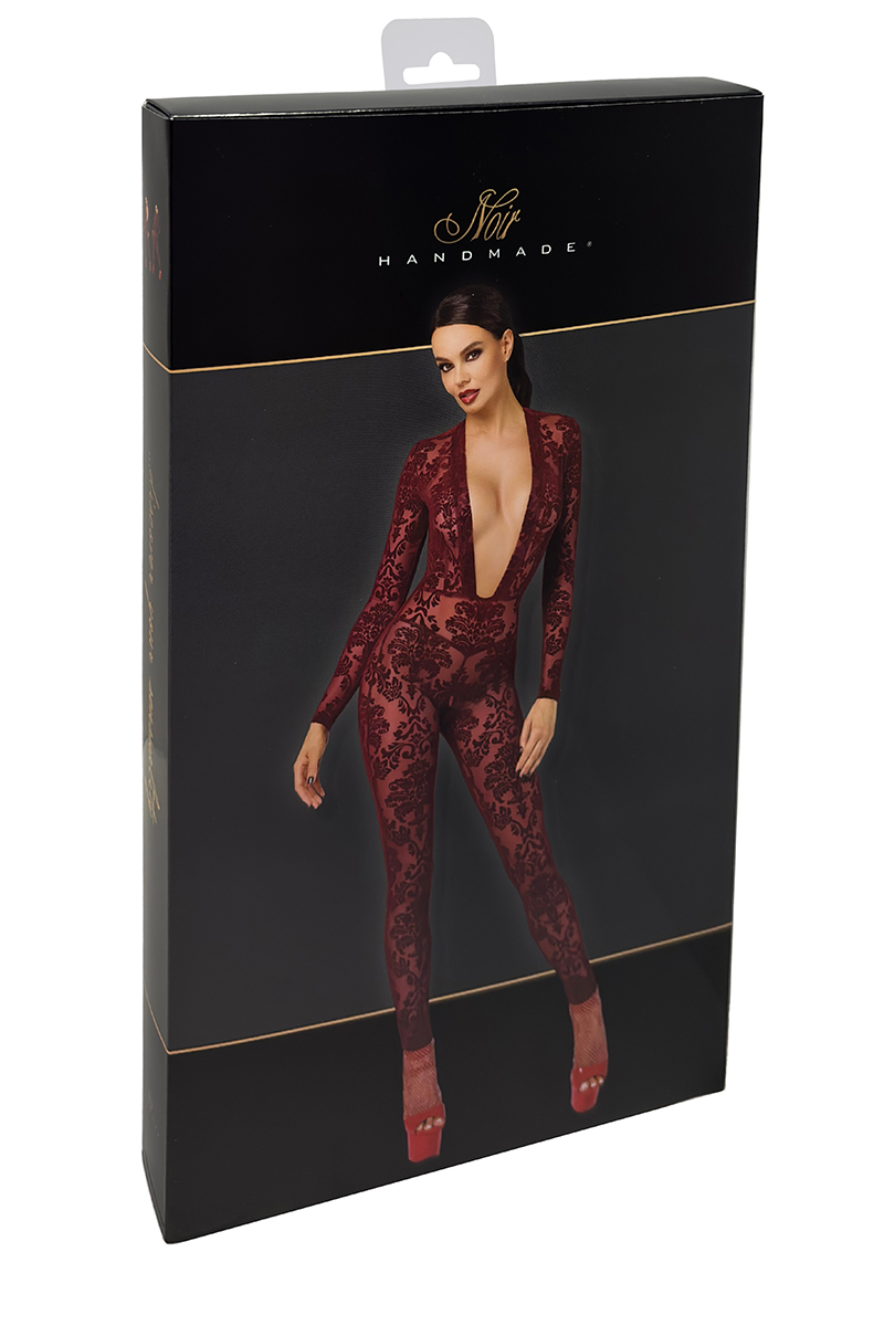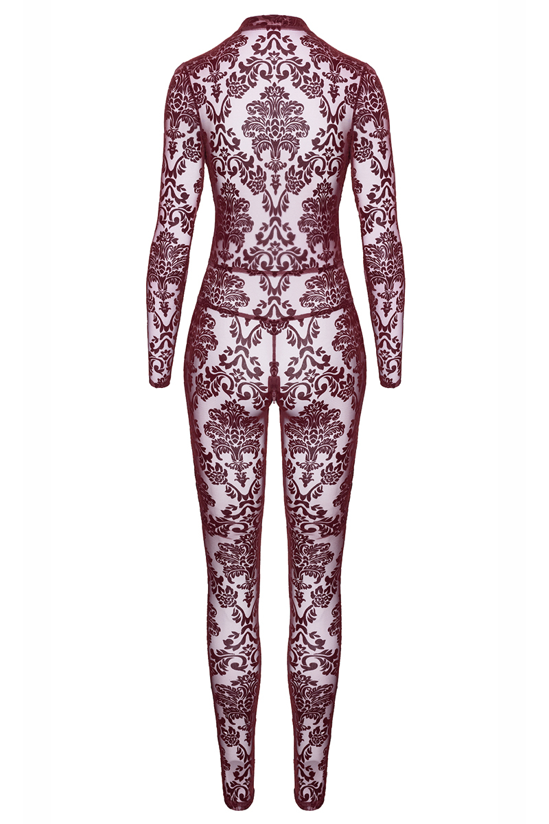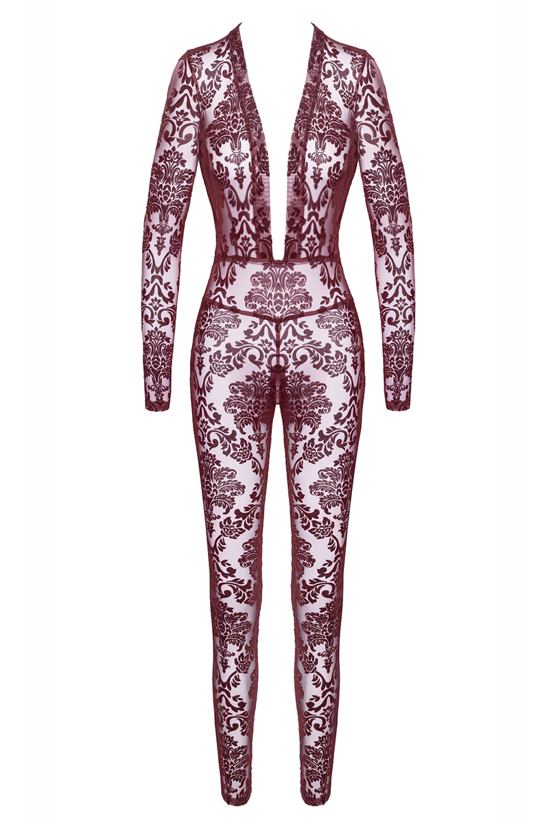 Luxueuse combinaison à manches longues avec décolleté plongeant, fabriquée en tulle transparente bordeaux.